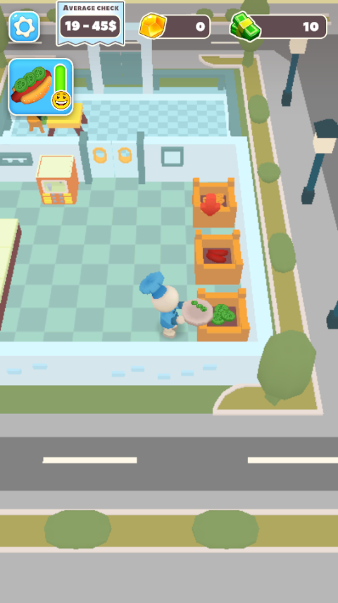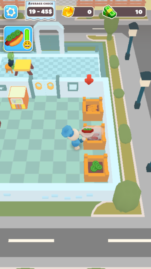 1、在本地下载打开该游戏,进入游戏主页面。你需要自己一家厨房,当迎来客人时要注意他们点的食物。比如这个客人点了热狗面包,你要走到蔬菜面前点击蔬菜,将绿色的蔬菜装盘。