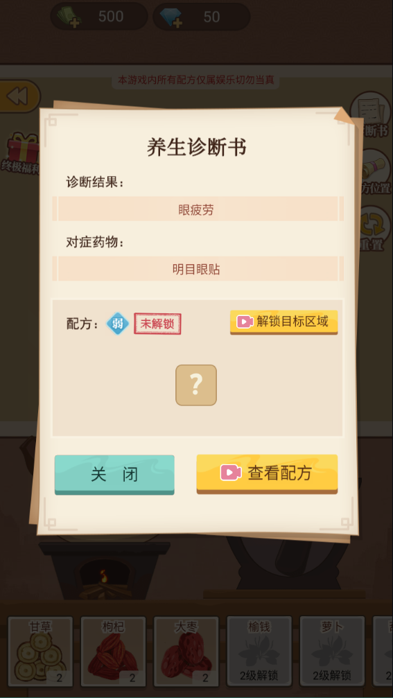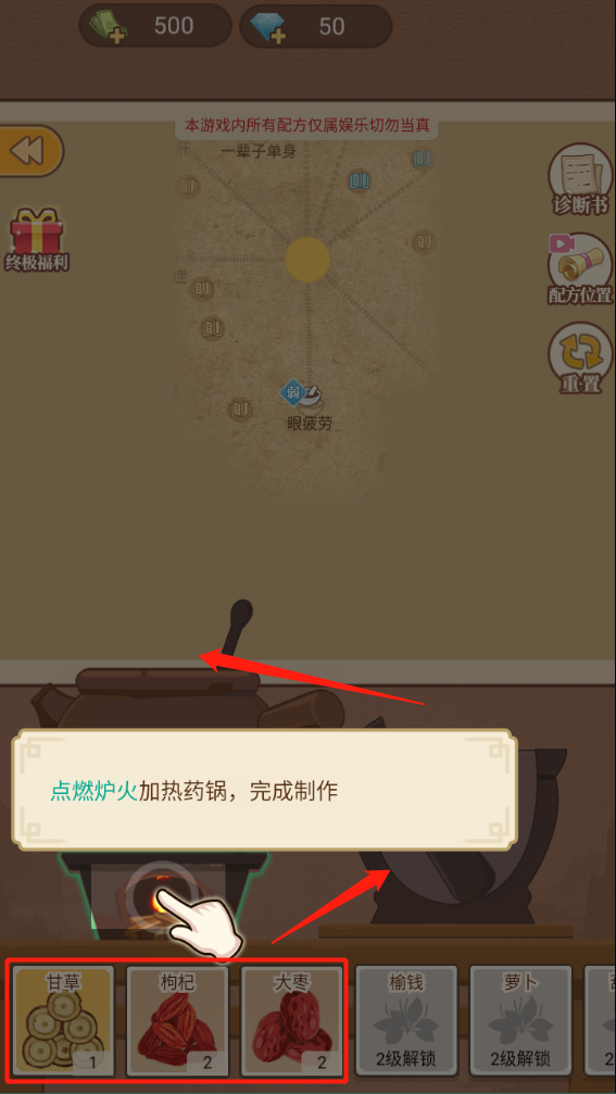 游戏的操作步骤也很简单:进入游戏后接诊第一位病人,了解他们的需求,然后开出诊断书并研制配方。以制作【明目眼贴】为例,先研磨甘草,再加热药锅完成制作,最后给顾客使用就能赚取利润了。除了基本玩法,还有每日礼包、采集药品和客人图鉴等功能。