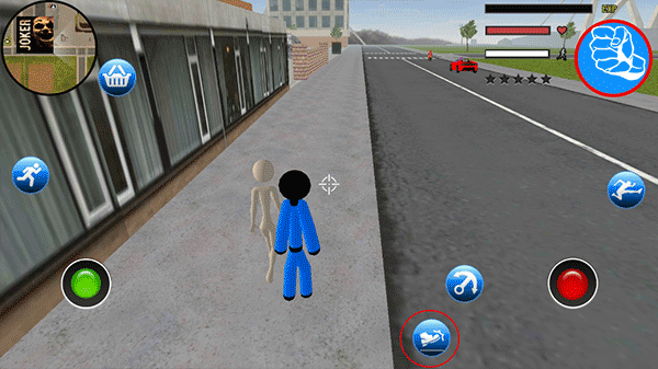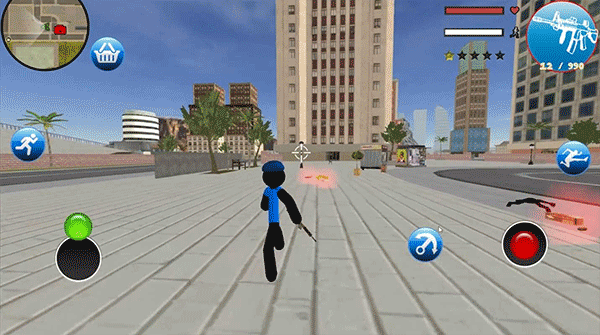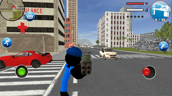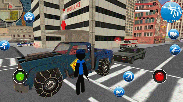 游戏玩法挺简单的,点开后选“play”就能开始。用左边的摇杆控制移动,右边有攻击、发射和踢腿的按键。你可以开车、攻击人物或物品,还能切换不同枪械比如scar和M4,得注意血量,被打太多就会死哦。