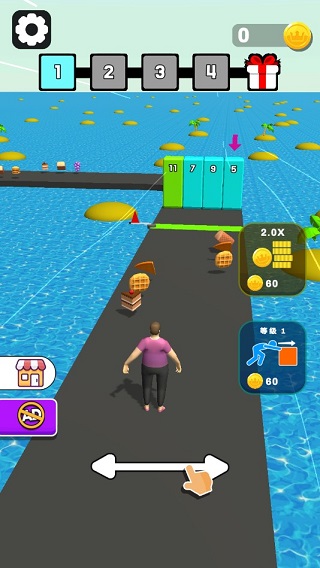 简单的玩法,仅凭一根单指就能进行操作,直白来讲就是仅需要控制角色左右跑动即可。玩家在关卡中的跑道上左右移动,或是收集金币、或是吞食各种美食,为前方的障碍积累足够的脂肪,避免遇到较大数字的时候,因为自身脂肪不足而闯关失败。是的,你没有看错,当玩家的角色脂肪不足且遇到数字较大的障碍时,角色最终会从壮硕的成年人逐渐瘦弱下去,最终变得瘦骨嶙峋而倒地不起。