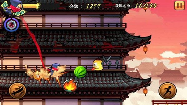 这款游戏是以忍者为主角进行的跑酷游戏。游戏中主角是一名忍着,通过杀敌,吃金币获得分数,在体力消耗完毕之前到达重点就算过关,分数越高所获得的星级就越高。这个游戏给我的感觉就是《天天酷跑》的感觉,两者玩起来大同小异。