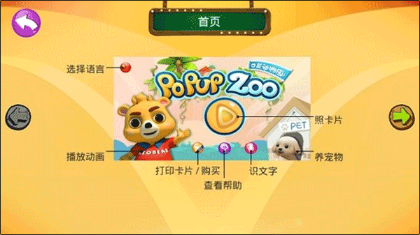 点击主界面上的“小狗”图标,进入后将摄像头对准印有宠物图案的特殊卡片,屏幕上就会出现各种操作提示,小朋友依照这些提示来喂养和照顾动物,动物就会每天长大!