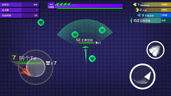 王牌空战是一款以纸飞机为模型的创意IO对战手游,该游戏操作灵敏,玩法简单,玩家在此首要的获胜条件就是能够维持长时间的生存,并努力存活到最后。这款游戏还以当下流行“吃鸡”游戏中缩圈机制为核心重点,随着安全区域的不断缩小,玩家所面临的生存挑战也将逐渐增大,同时伴随着激烈的战斗,消灭对手完成升级,以此提升自己的战斗实力。王牌空战的射击玩法非常独特,导弹功能的自动跟踪,使得战机无处遁形,而你唯一能够做到的除了蛇皮走位,还有飞机的隐身功能,但由于隐身功能在使用的过程中会出现冷却时间,因此怎样的合理利用就决定玩家对于战况的把握和对你走位的自信了,现在下载体验,还能获取更多精美皮肤哦,喜欢的朋友可千万不要错过哦!