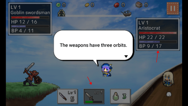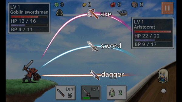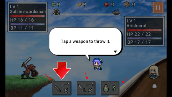 武器投掷RPG官方正版是一款玩法类似于勇者斗恶龙的手机游戏,同时本次小编带来的也是武器投掷1最新版本,该游戏虽然是像素画风,但是游戏高质量的剧情和丰富多彩的道具玩法让这款像素游戏变得趣味横生,无可挑剔,既然看上了,就一定要玩个痛快。游戏的玩法非常的简单,玩家只需要投掷你的武器去攻击敌人,如果敌人也投掷了武器,那么你可以按照那个轨迹投掷武器来防御;你还可以挑选6个可用的英雄到各个岛上去跟敌人战斗,像冒险者、贵族、空贼等,根据战斗不同分别使用各个参数不同的角色!并且玩家战斗到后面还能获得你的宠物,心动了吗?