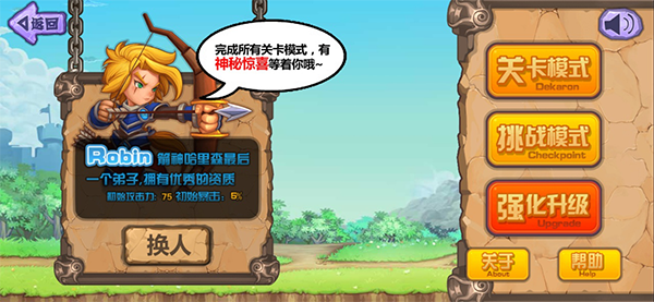天天神射手游戏是一款微小迷你塔防小游戏,就游戏风格来看,画风精美,各种场景设计都制作的非常细致,而且玩法模式也特备丰富,别看内存只有10M,却一点不输市面上的流行热门游戏,该游戏的功能一应俱全,充分应征了那句,麻雀虽小五脏俱全。在天天神射手游戏中共有两种模式,分别为关卡模式和挑战模式,能够选择的英雄也有两款,Robin和Angela,他们各自拥有独特的属性提升、加成,不论在关卡模式或者挑战模式中,通过完成任务目标获取星星,从而强化升级武器、角色,亦或者是充值技能,总之这款游戏虽小,但基本的玩法操作,一点也不会让你感觉单调,有喜欢的小伙伴们,就抓紧时间下载收藏吧!