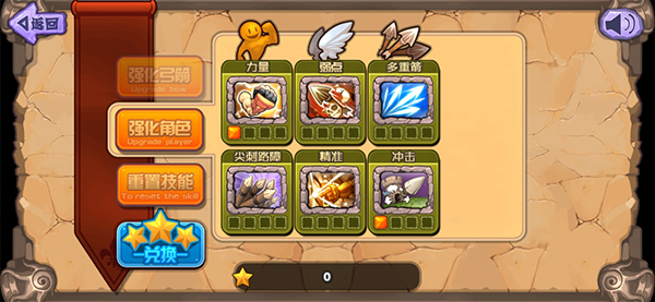 在技能升级的分类上很多样,除了可以对角色进行各种属性升级外,我们还可以对弓箭进行升级。游戏中的升级并不是通过金币升级,而是通过每次通过后我们获得的评级星星来升级。因为星星有限,所以在加点上玩家也必须对技能有所取舍,不同的加点方式也让游戏有了不同的玩法,游戏的耐玩度自然也就提升了。