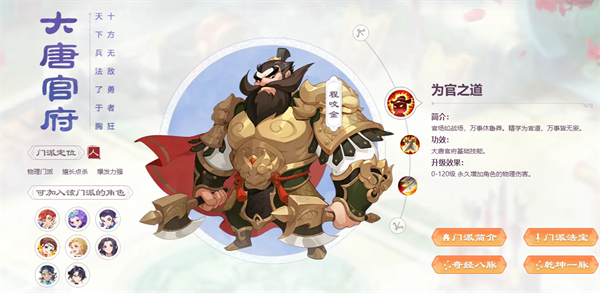 大唐子弟曾随唐皇征战天下,立下汗马功劳,门派师父程咬金更是凌烟阁功臣榜上第一猛将。门下弟子个个骁勇威武,不仅深谙为官之道,更具文韬武略。其武功招式偏重物理攻击,以强大的爆发力著称。