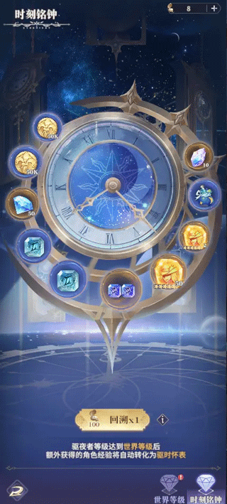 在逐光协会里,凭空出现了一座只存在于传说的时钟,它可以将过去的经验化为能看得见的物品,轻轻拨动了一下就拿到了许多东西,看来书上说的没错:时刻铭钟记录着提亚大陆的变迁,也会记载成长历程,从历程中产生出的额外经验将可在此钟完成回溯,获得时间女神相应的奖励。