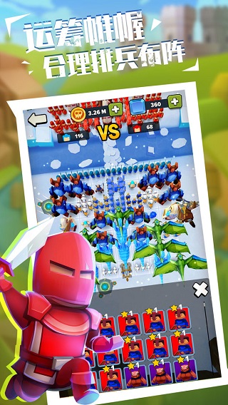 军团大战手机版是一款迷你版的军事战略游戏,游戏中所提供的竖屏战斗界面,更加便于玩家单指操控,而且卡通的精美画风,适宜的年龄范围更广!游戏玩法主要以放置+闯关为主,在这里玩家只需在战斗开始期间,根据敌人的数量和站位来调整你的兵力部署,随后在战斗环节内,点击屏幕上的其他位置可以增加兵力,与此同时,海量关卡的精妙设计,让每场较量都有大不同,在后续的部分关卡中,还有丰厚的宝箱奖励和兵种可以解锁。