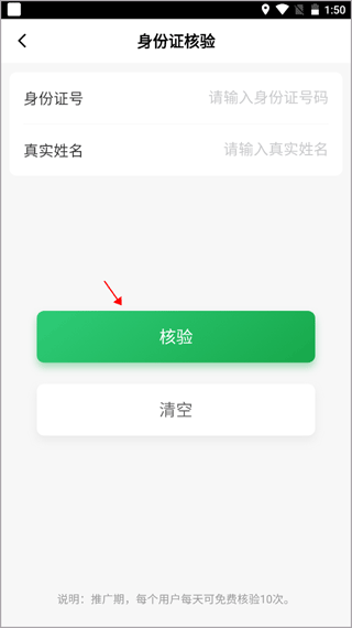 2、输入你的身份证号码和真实姓名,点击按钮“核验”,就可以审核你的身份证信息了。
