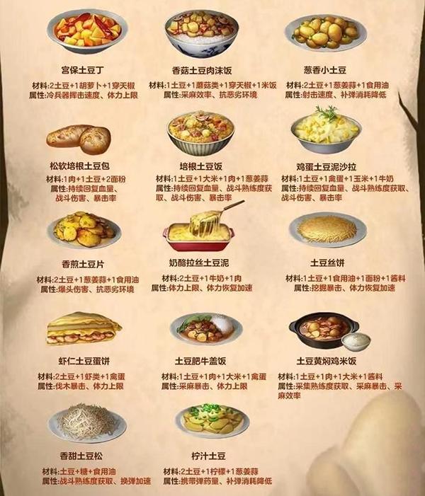 土豆食谱大多以战斗力提升为主,例如:战斗伤害、暴击率、射击距离、冷兵器挥砍速度、射击速度、移动速度、战斗熟练度获取、换弹加速、携带弹药量、补单消耗降低、生命回复等等。