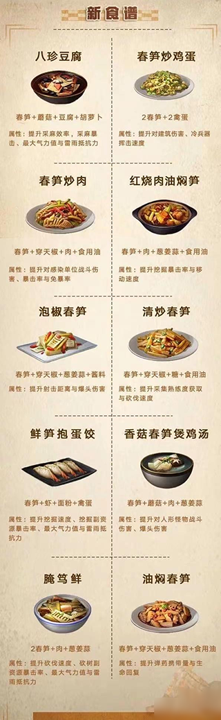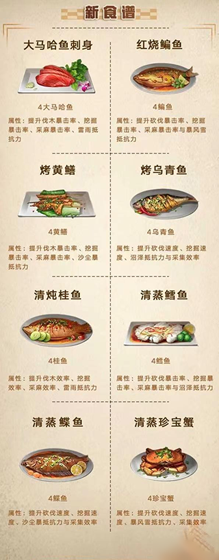 还有剩余的一些食谱都是较为全能型的,包括一些鱼类食谱也是可以大幅增加采集效率的,具体的制作材料需求可以看下方我为大家分享的食谱图。