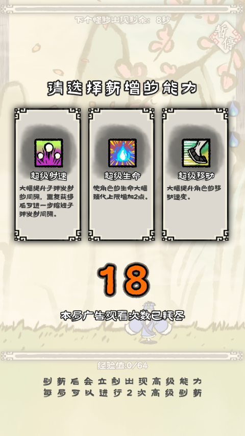 3、闯关成功后会进入下面一个梦,这个时候你可以新增一个功能,建议选择超级射速,因为下一关的怪物数字比较大。