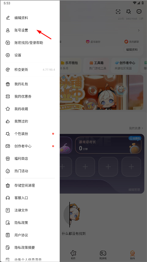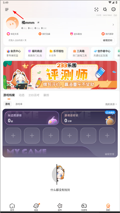 1、打开233乐园,进入后点击右下角“我的”,再点击左上角“三”打开菜单;