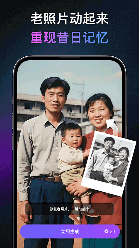 2、照片互动:让静态图像呈现亲吻、跳舞等动态效果,为老照片注入新活力,增添趣味性。
