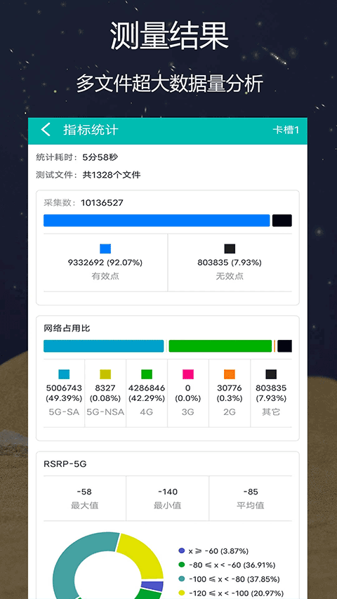 3、室外、室内、轨迹测试支持RSRP/RSRQ/SINR/PCI/无线/下载/上传等测试类型;