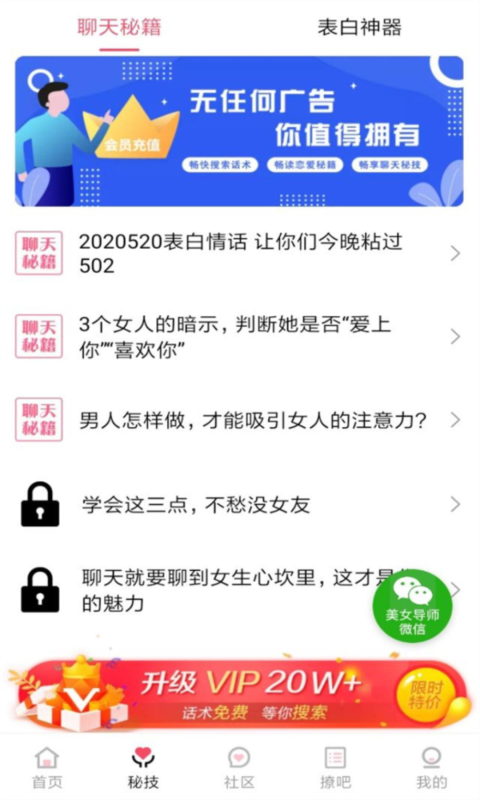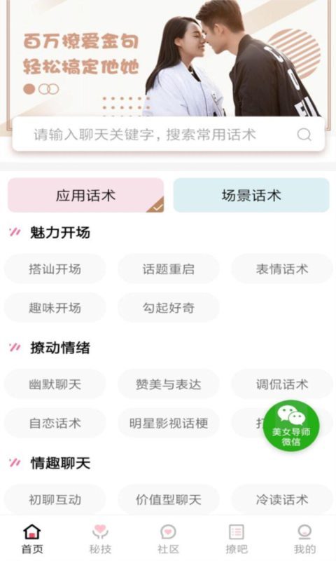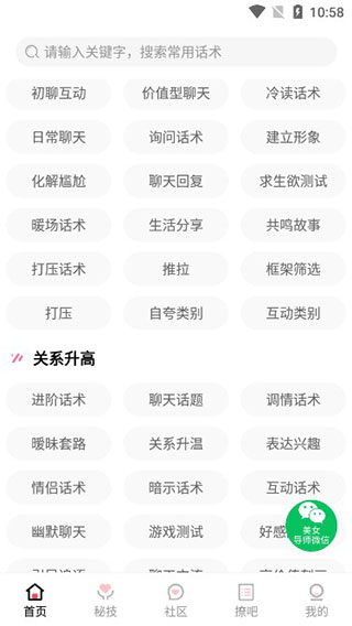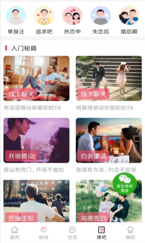 2、登录成功后进入软件首界面,可以看到有非常多不同类型的搭讪技巧,用户可根据不同时期作为参考;