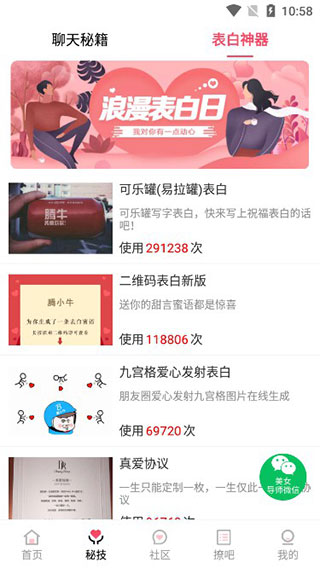 4、在秘技界面中,有许多聊天秘籍和表白神器,保证让你收获甜甜的爱情;