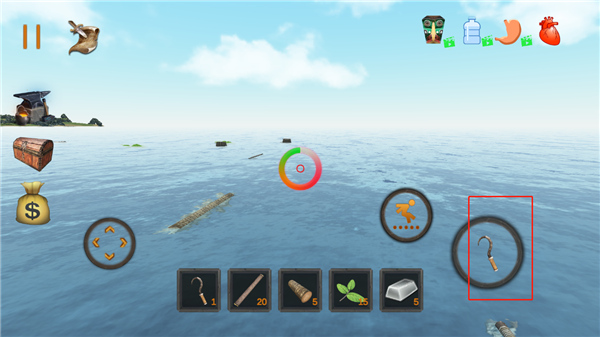 8、正式进入游戏后,玩家可以长按钩子,将它发射到海洋中,红色的小圆圈代表发射位置,发出钩子后,玩家要看准时机,及时的点击同样图标,收回绳子取取回勾到的物资,如木板,杂物,树叶,桶等,它们通过加工可以为你的生存提供方便;