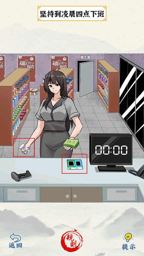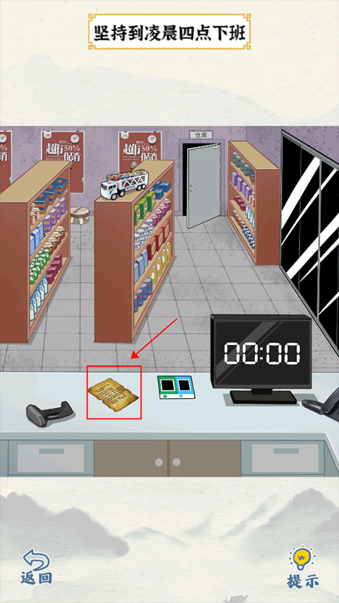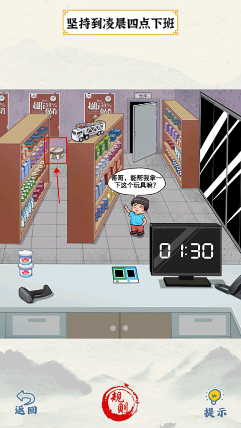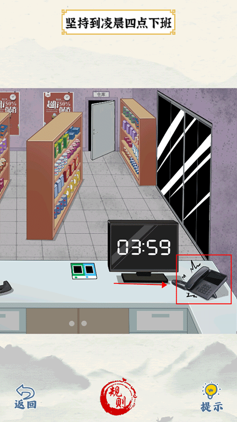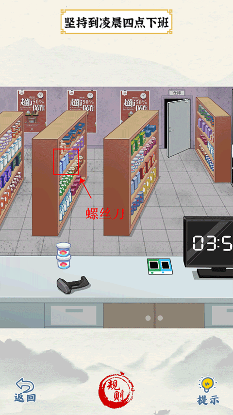 7、电话铃声:点击电话,拖动货架上的商品,找到螺丝刀,如何拖动螺丝刀到显示器上把时间变成四点,再点击门通关