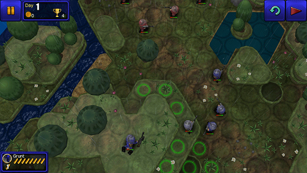 前三种难度下以突击队员的强悍攻击力和防御力,完成任务不难。Ridiculous级的敌军攻击力太高,满血特种兵也不能在一回合内承受1个步兵加1个狙击手的攻击,需要小心移动,停在敌兵的最大攻击范围外。中间还要到回复池补一次血。走上边的路用时7-8回合。