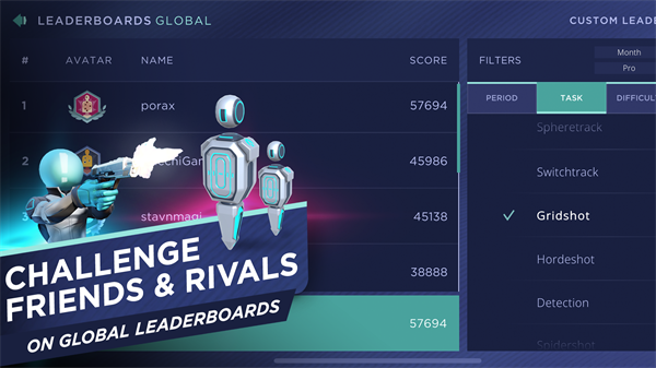 为了成为最强者而刻苦训练,并不意味着在这一过程中享受不到乐趣。瞄准实验室手机版提供了 15 个小游戏类型的任务(之后还会加入更多),这些小游戏都将专注于某几项在冲击排行榜第一名时必备的技术。训练并提升速度、命中率、反应时间、反应射击、快速反应、头部射击等各多项指标。
