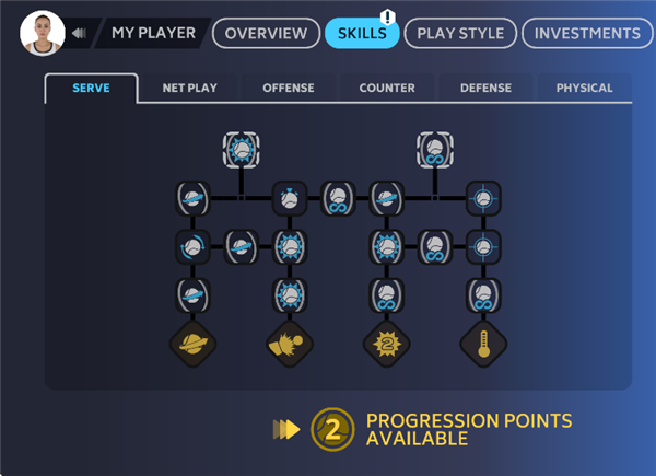 9、在【SKILLS】界面共有6个技能树,通过解锁属性来进步,玩家可以使用每次升级获得的进阶点来塑造你想要成为的球员!