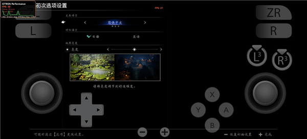 3、进入游戏界面设置语言以及亮度,点击+号确认;