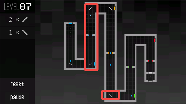 游戏共有63个关卡,分为7个主题,每个主题都有独特的音乐和音效,难度从简单到极具挑战递增。关卡攻略提供了具体步骤,比如第二关需要先放两个挡板打开门,再放第三个;第七关则需要分步骤放置不同斜板打开不同颜色的门。