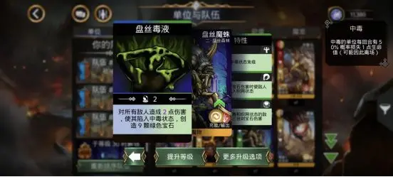 例如盘丝魔蛛的主动技能「盘丝毒液」:它的效果是对所有敌人造成伤害,并使其陷入中毒状态 。 再回头看它的第三特性「强力毒素」:攻击中毒敌人造成三倍伤害。