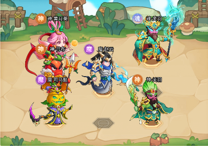 前排魂关羽、神·关羽负责单体秒杀,神·吕布与魔·司马懿能够互相搭配造成全体aoe控制,魔·赵云对存活的单位造成多段斩杀伤害,神·黄月英为队友提供治疗与复活。
