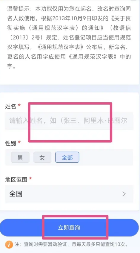 2、输入姓名,点击【立即查询】即可查询同名人数