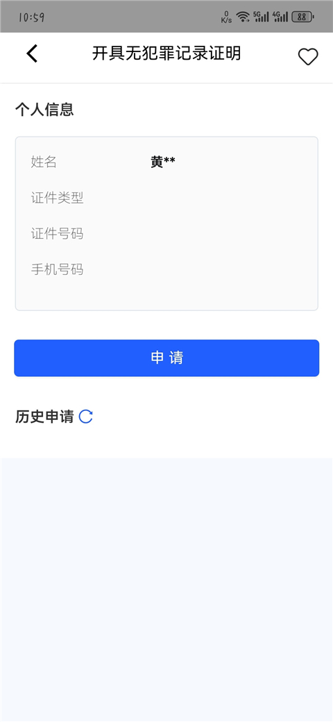 2、进入申请页面。如果你已经在这个App注册过,你的身份信息就已经保存下来了,一个字都不用输入直接点“申请”就进入下一步。如果是第一次使用,需要先注册、登录,然后再“申请”