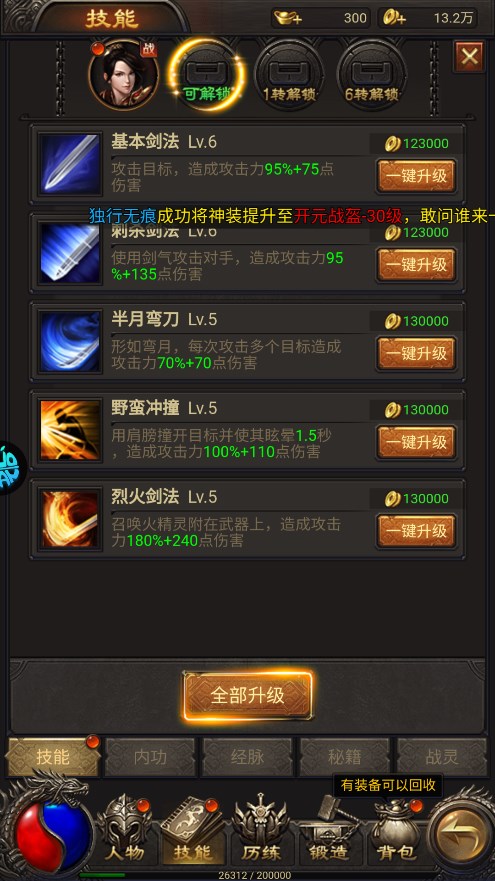内供系统提升金币消耗较高,建议先升级人物技能,等级固定后升级内功!