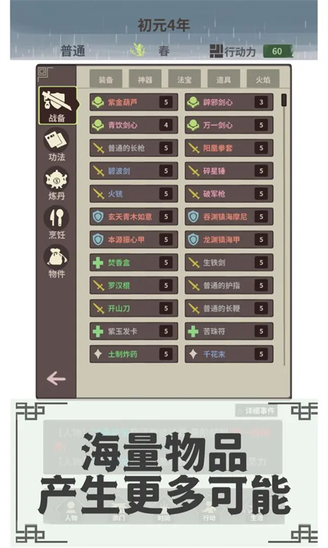 值得一提的是,为了让玩家能有更好的代入感,游戏使用了高级的渲染技术,打造出一个特别真实的江湖环境,带来了更多的游戏关卡,自由选择未来的发展,学习更多武功绝学秒杀所有敌人,特别考验你的作战才能。除此之外,在伏魔人偶转生模拟器最新版游戏中还有各大特色门派可以选择,每一个门派都有加入门槛,你必须在人生前段加强修行,最后才能成功入门,你还能在门派中学到各种特色武功,开发特殊技能,十分有趣。此外,游戏中还拥有着多样的武器装备,每个装备的属性各不相同,你需要认真熟悉它们才能灵活使用,非常真实,感兴趣的小伙伴快来下载体验吧。