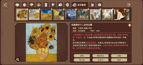 2、赏析绘画艺术之美,除去关卡挑战的消除玩法之外,游戏的另一个核心玩法就是去赏析我们所搜集到的那些世界名画。每一幅我们所搜集到的世界名画,我们都可以为其填充标签,而这方面的内容除去一些像是男性/女性一些很明显的标签之外,我们都需要在游戏中尽可能多的搜集各种资料、整理相关文献信息,最终来完成对于每一幅画作的完整解析,从而得以最终享受真正的绘画艺术之美;