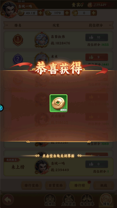 2、每日在擂台排行榜中点赞也可获得铜钱。