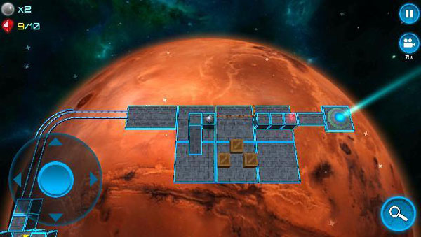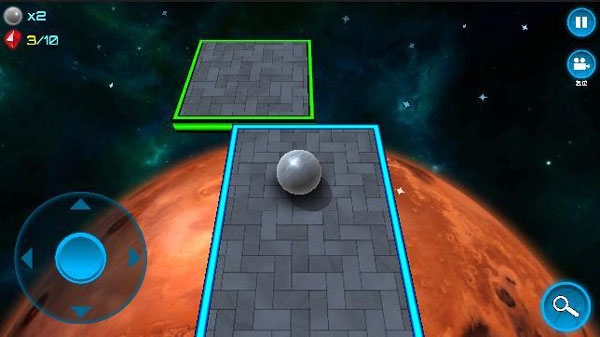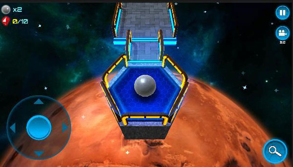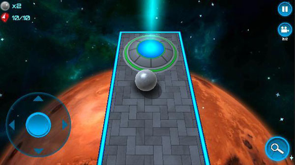 第一关是入门关卡,主要是为了熟悉操作,没啥难度。左上角显示剩余生命,每关只有三条命(可以在选关界面用水晶增加生命的上限)。每个关卡中都分布着十个水晶(有的水晶的位置可不好找),左上角可以看到已收集的水晶数。右上角是暂停按钮和摄像机复位按钮。手指滑动屏幕可以移动视角,这对于后期某些复杂的关卡极为重要。按一下摄像机复位按钮,视角就会恢复到默认状态。左下角是虚拟摇杆,可以控制小球向不同方向运动。右下角的放大镜按钮按住不放可以暂时切换成鸟瞰模式,卡关的时候可以使用鸟瞰模式分析关卡的结构。