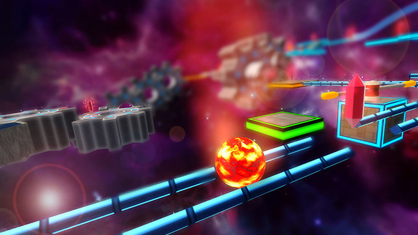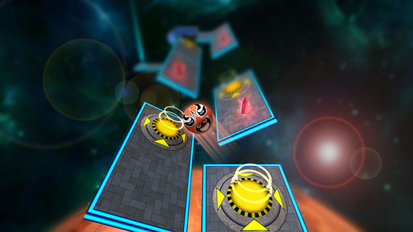 移动到这里,会发现这种闪着蓝光的柱子。前面蓝色边框的地板是静态的,这里也不例外,这些柱子都不会动。但是,这种柱子的弹性很好。如果不小心碰到它,它会把小球向反方向弹开。这里的路面还较宽,没有太大的危险。后期的关卡有这种柱子和其他陷阱的组合机关,一旦不小心碰到柱子,就很可能被坑爹地弹进陷阱里。