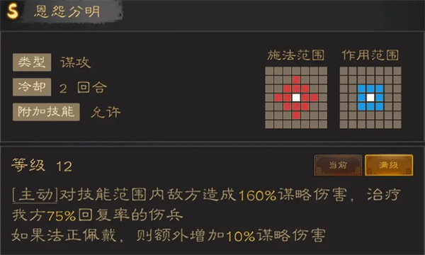 2格+9宫格输出兼回复,当前金谋略输出技能太少,这还是个9宫格AOE,变相等同于加了4格射程。最大的问题还是倍率不高,适合压血线,不适合作为主力核心输出技能。