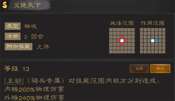 高倍率两格范围AOE,就倍率而言几乎是早期能入手的技能里倍率最高的一批了,适合所有近身骑兵将,专走秒杀路线。唯一的缺陷在于没法对着空地释放,必须跟人脸贴脸,也就意味着会吃反击,也很难直接从安全区域切入秒人。需要配合再动或者后续的加移动力的机制才能完全发挥。