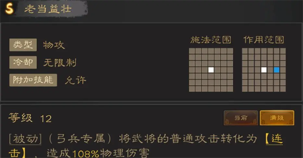 都属于被动技能,老当益壮附带连击效果,近战比较推荐。所有增幅普攻类的技能由于由于射程限制,大多很难发挥实际作用,毕竟枪兵手短,几乎没太多机会普攻。弓兵有多种3格白嫖的伤害机制,也很少会用普攻补伤害。想用也只建议怒喝破敌+解烦军、老当益壮+破风长箭这种搭配方式,通过不断叠加普攻增益来增加普攻收益。
