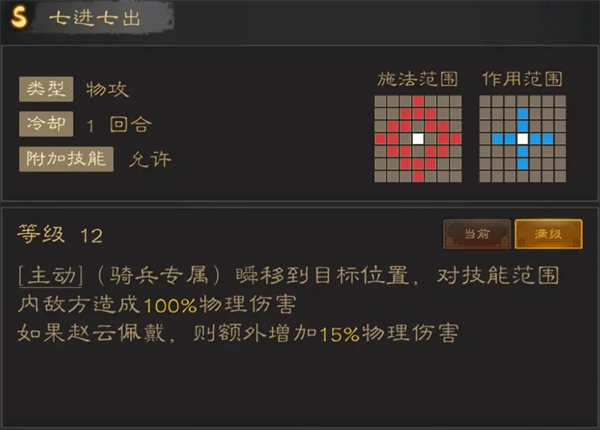 赵云专属技能,与赵云的适配度为100%,3格射程外加两格十字AOE,等同于射程增加了5格!最大问题在于伤害倍率不高,给赵云用是飞入人群秒一切,给其他将就只能作为压血线或者突入战场的辅助技能。