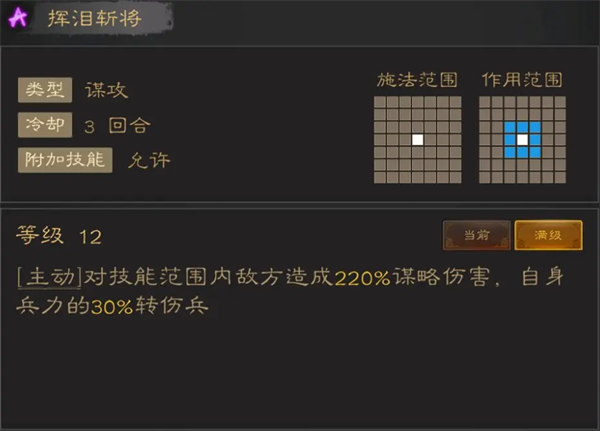 高倍率谋略AOE,伤兵本身没啥太大影响,最大的缺陷在于范围太小,最好配合高移动力的谋略将使用。一般情况都是诸葛带,放完再动后上去压点血线。