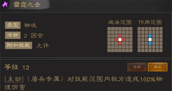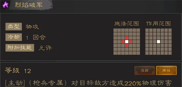 目前唯一可用的各类紫色输出技能,由于目前物理盾将少,雷霆之击没啥用武之地,不然作为一个AOE技能还是有一战之力的。而烈焰破军则因为其攻击范围问题,只能作为物理枪将的备选技能,属于没啥可带才带的类型。
