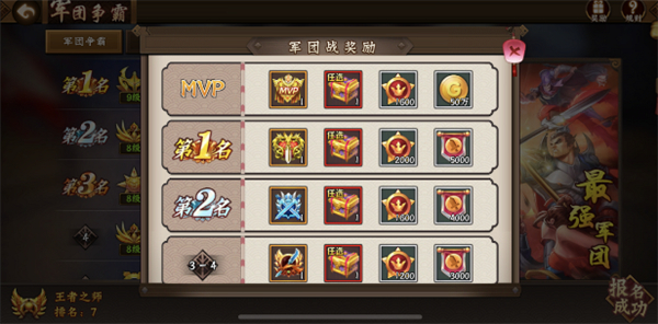 每个月的最后一周一般为军团争霸赛的报名及参赛期,玩家可以由军团长报名参加军团争霸赛。军团争霸赛是王者之师的荣誉之战,成为冠军的最强军团可以永久地记录在最强军团的编年史册上面,从而受全服玩家的敬仰膜拜。除了荣誉之外,获得军团争霸赛的前四名的军团,其内部所有军团成员都能够获得大量的军功、称号及S武将体验皮肤的奖励,真可谓荣誉奖金两手都要抓,两手都要满。