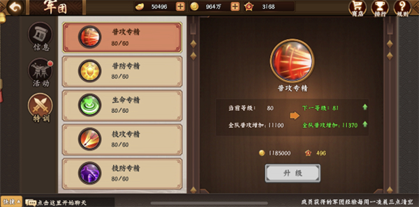 在军团内,有着独一无二的军团特训系统,玩家通过该系统可以逐步地提升个人的普攻、普防、生命、技攻、技防等基础属性,这对玩家属性的提升有着非常大的帮助。