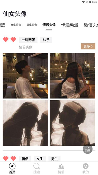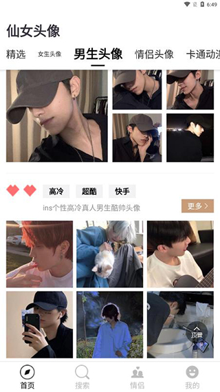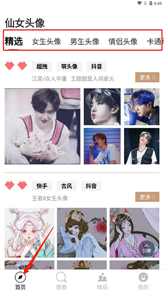 1、在首页可以找到精选、女生头像、男生头像、情侣头像、卡通动漫等各种类型的头像;