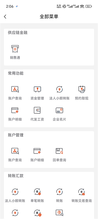 2、在【全部菜单】页面,可找到供应链金融(如销售通)、常用功能(账户查询等)、账户管理(账户查询等)、转账汇款(法人小额转账等)等板块,根据需要选择并办理相应业务。