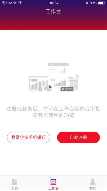 3、切换至【工作台】时,需先点击【登录企业手机银行】完成登录。登录成功后,即可使用对应的工作台功能进行业务处理与管理。